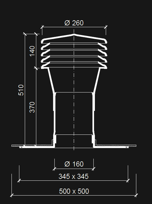 TOPWET roof vent with an integrated custom made sleeve (EPDM, TPO, FPO, PR, STE - suitable for cold liquid applied applications), including a rain cap. Height 300 mm, 500 mm on request.