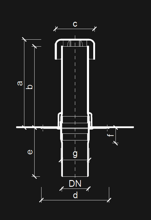 TOPWET sewerage ventilation for connection to vent piping with an integrated sleeve of a modified bitumen strip, including a rain cap. Height above insulation 300 mm (max. 500 mm), depth under insulation 200 mm (max. 1000 mm).